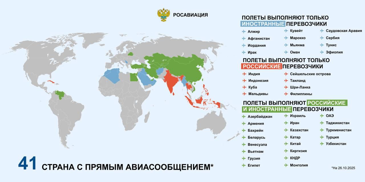 Российские и зарубежные перевозчики в зимнем расписании выполняют прямые рейсы в 41 страну, следует из инфографики Росавиации в Telegram-канале ведомства.